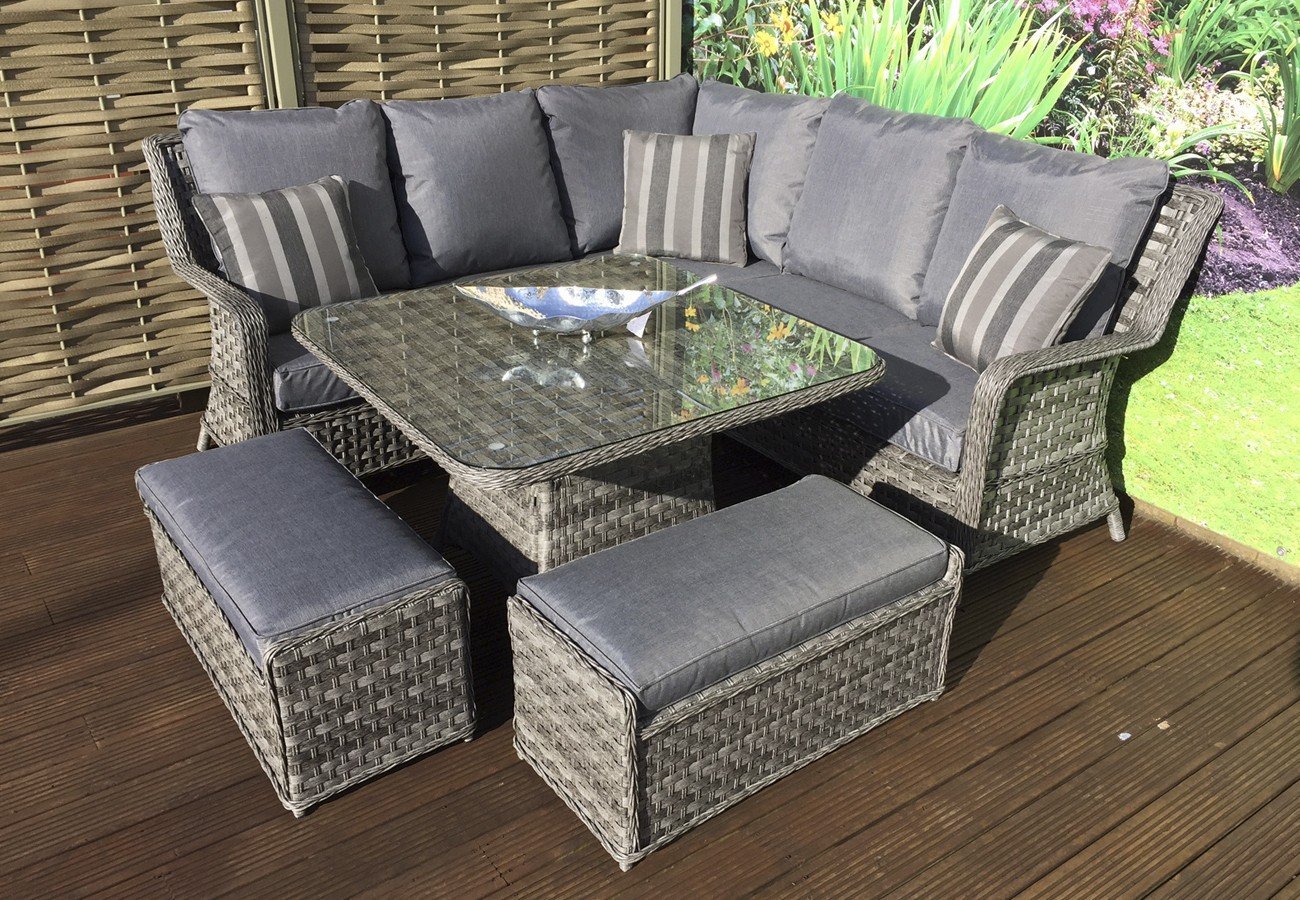 Mia compact corner dining sofa in 3 weave grey rattan is woven in polyethylene plastic wicker on to fully assembled aluminium frames. The sofa comes in 3 sections and is easily linked together with larger plastic clips which connects the frames from underneath. This dining sofa set also includes a 100cm square dining table with glass top, plus 2 small bench seats which are suitable for 1 adult or 2 children to sit on. The seating comes with all the seat and back cushions shown and all cushions have removeable covers to allow for washing. We recommend that the cushions are removed when not in use, to protect the fabric from fading in the UV light. If you don't want to store the cushions in the house during the summer you might consider one of our rattan cushion boxes in matching grey weave, available in medium or extra large.