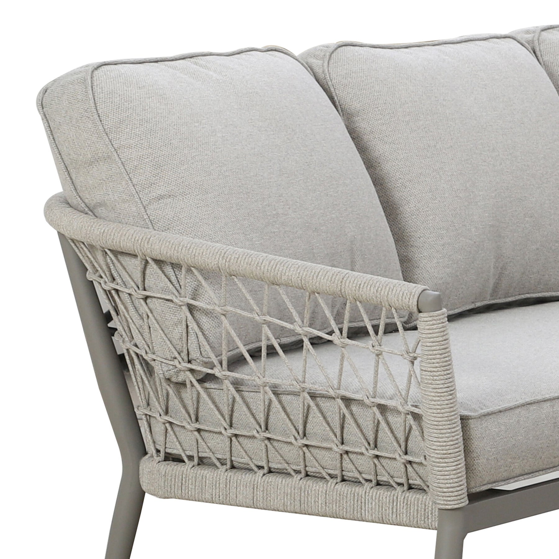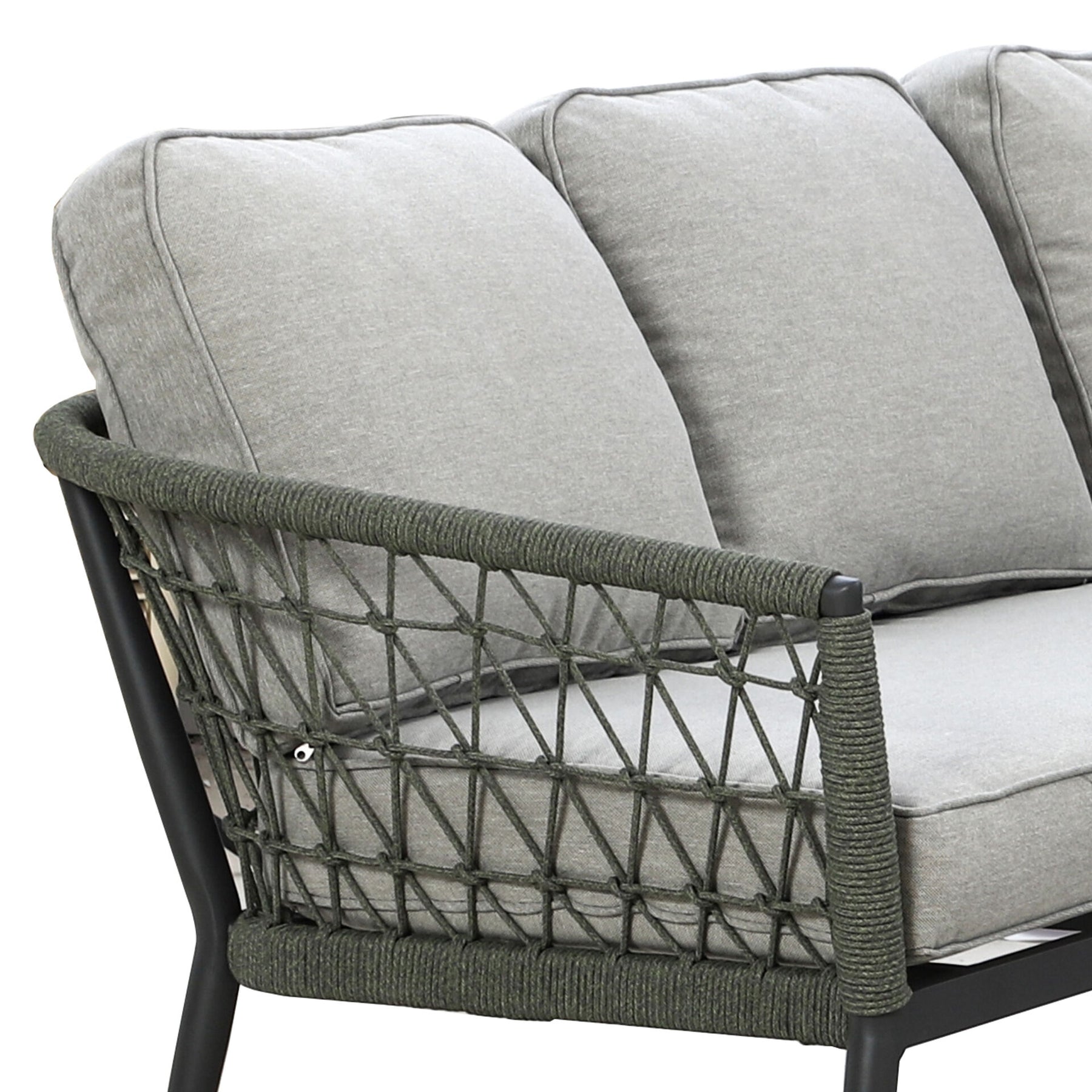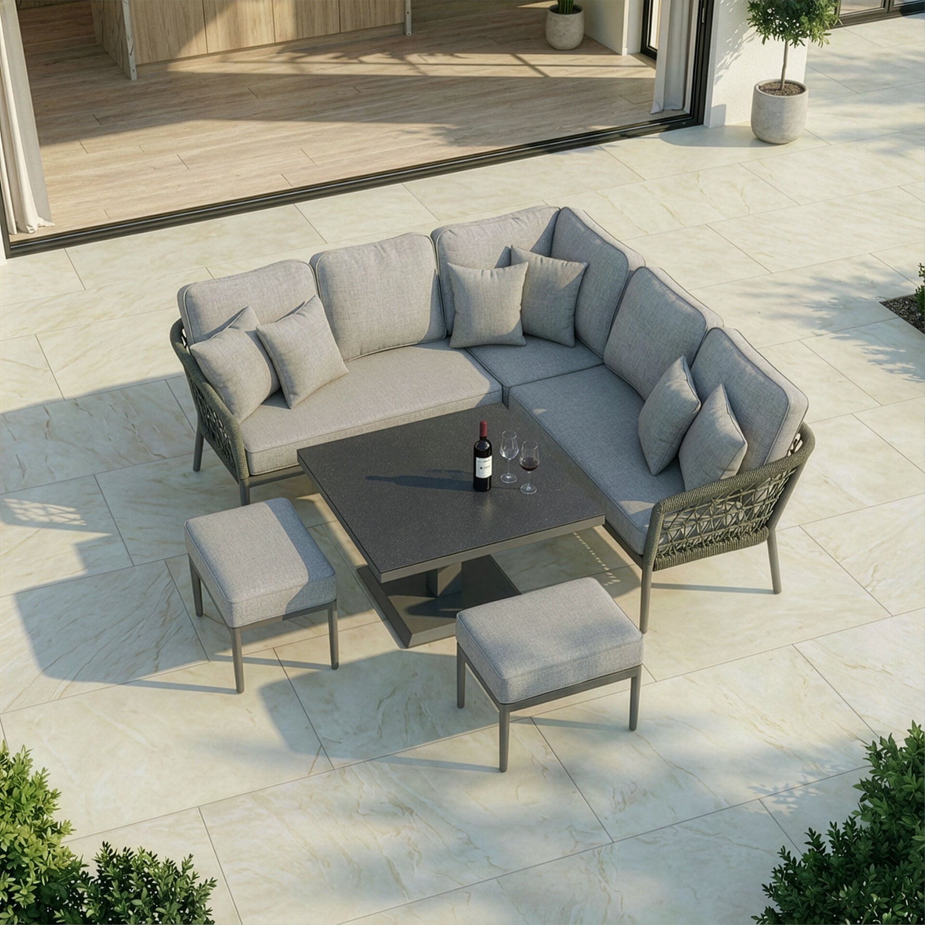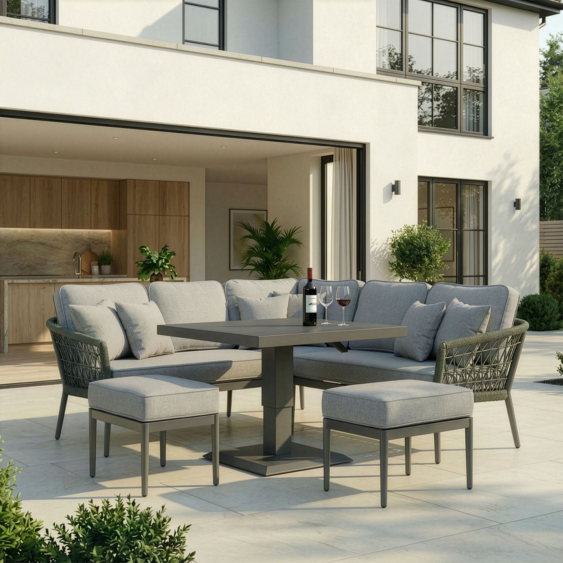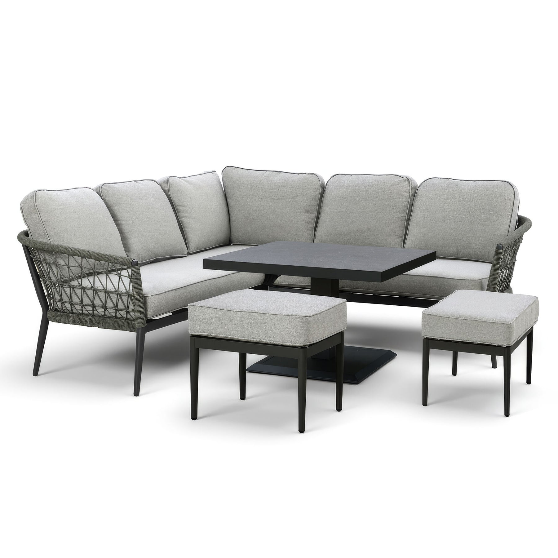 Introducing the Monaco Small Corner Sofa Set with Rising Table and 2 Footstools, a stylish and cosy addition to your outdoor living space. This compact yet luxurious set is part of our Monaco collection, thoughtfully designed to deliver comfort, versatility, and refined elegance in any outdoor area, from patios and balconies to garden nooks. The sofa features a chic square design, ideal for maximising seating in smaller spaces without compromising on style. Crafted with sweeping curved frames and finished with intricate ivy green knotted rope detailing, this set proudly reflects the signature look of the Monaco collection. The generously thick, plush cushions are enhanced with elegant piped edges, providing exceptional comfort for lounging and entertaining. Upholstered in high-performance SeasonSure fabric, the cushions are weather-resistant, durable, and easy to care for, helping your furniture stay fresh and inviting throughout the seasons. Completing the set is a versatile square rising table, designed to adjust effortlessly between coffee and dining height, making it perfect for both relaxed drinks and outdoor meals. Two coordinating footstools are also included, offering extra seating or a comfortable place to put your feet up and unwind. The Monaco Small Corner Sofa Set combines contemporary style with everyday practicality, making it an ideal choice for creating a luxurious yet functional outdoor retreat. Whether enjoying a quiet morning coffee or entertaining guests, this set provides the perfect space to relax in comfort and style.