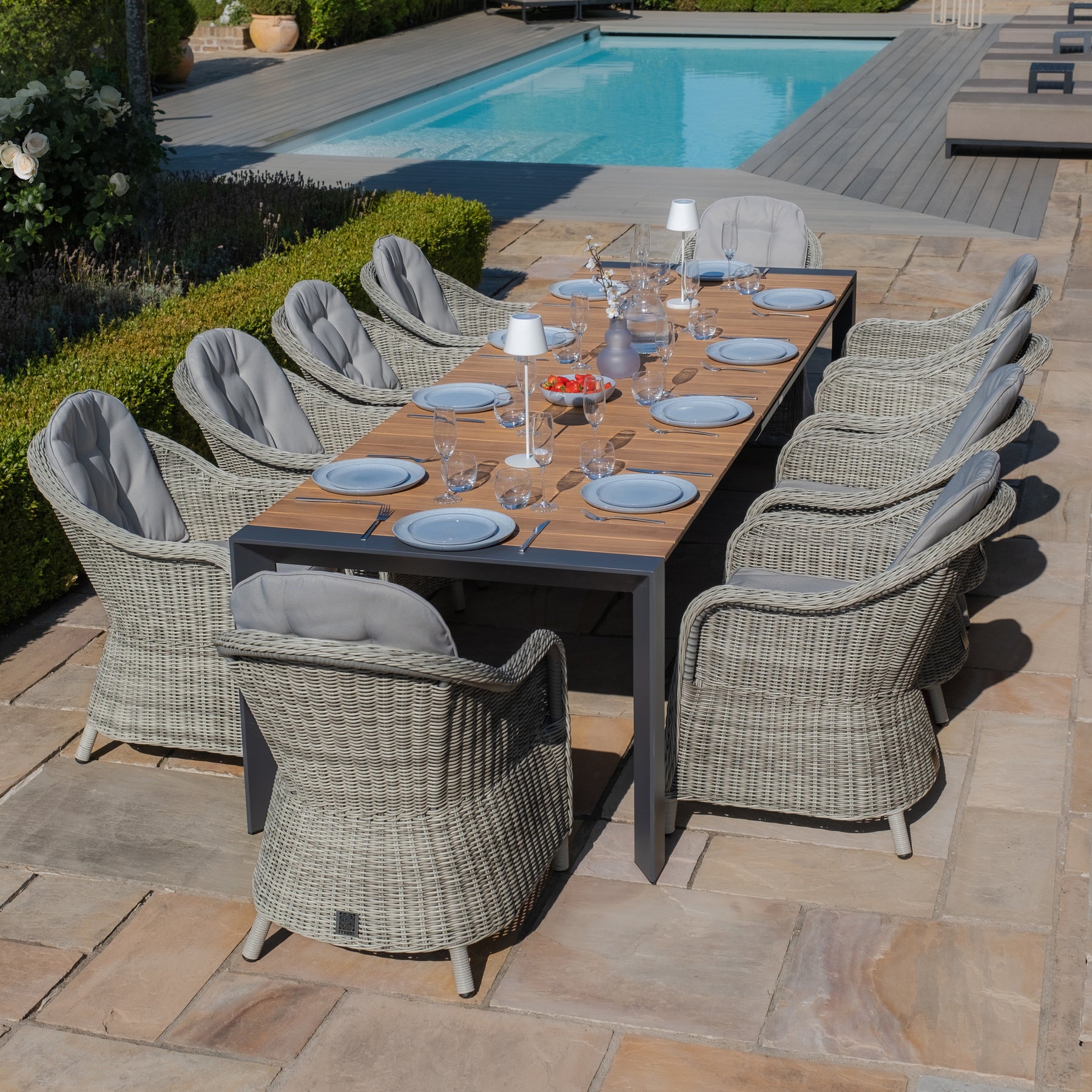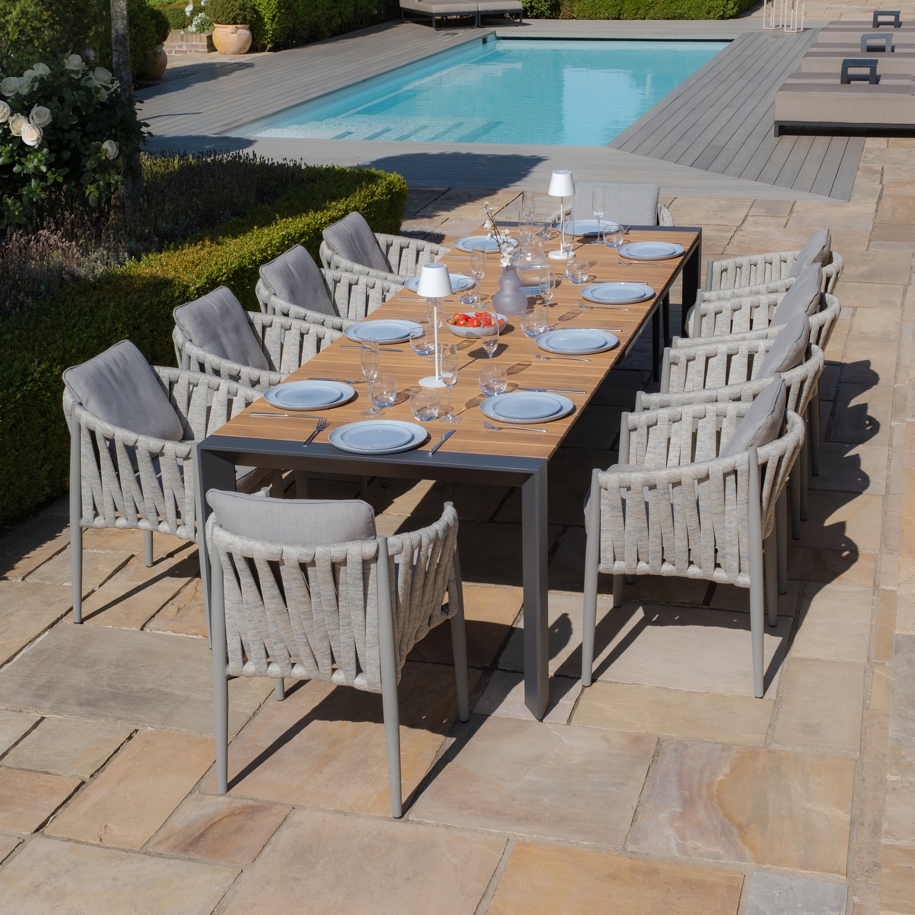 Ideal for social gatherings of any size, the Maze Teak Extending Dining Table is a stylish way to expand your dining table from up to 6 guests to up to 10 guests for those larger events. The staggered design allows you to take the standard-length table to one size larger allowing for 8 guests, or if needed, extend again to allow up to the maximum seating capacity of 10. The dining table is finished with a premium teak tabletop, giving the beautiful natural warmth of real wood. The deep lustrous tones of the teak complement the dark grey framework, combining lighter tones of the dining set to create an elegant outdoor dining experience. The teak table comes in three parts to accommodate the tiered extensions, these parts neatly tuck away in concealed shelving within the framework within the tabletop.