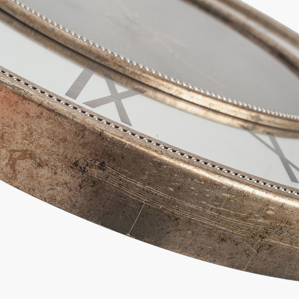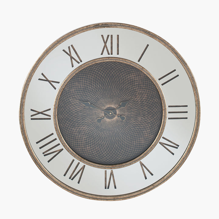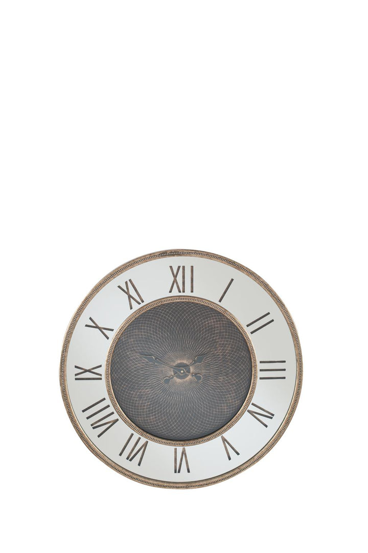 This stunning, circular, antique gold metal mirrored clock really deserves 'a moment in time', to stop, look and admire. The combination of the roman numerals along with the antique gold metal and mirrored frame create a contemporary yet traditional timepiece.