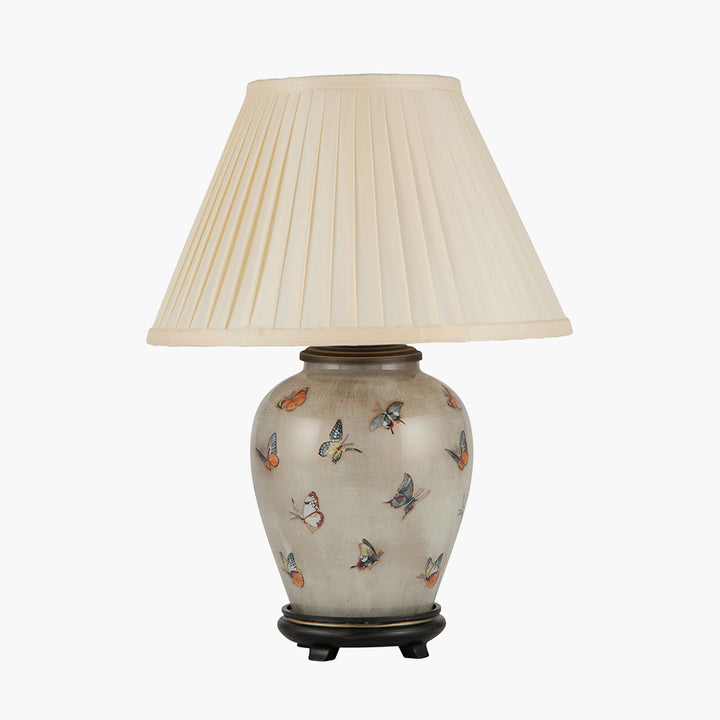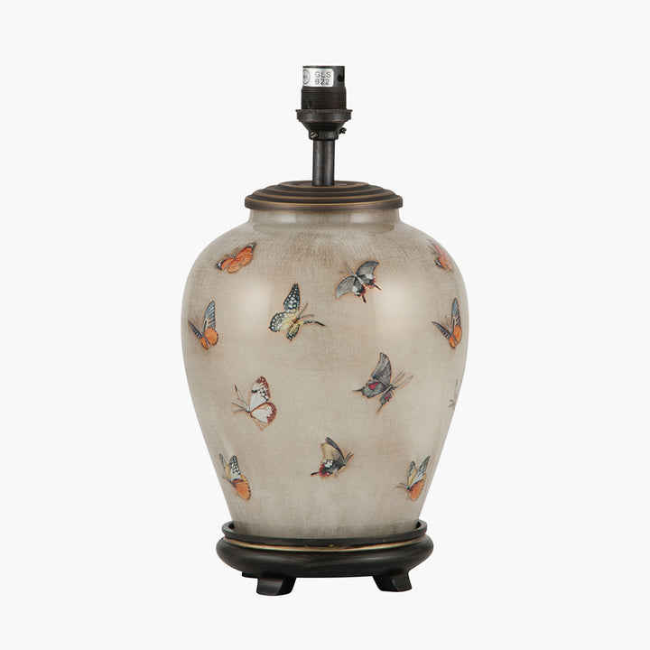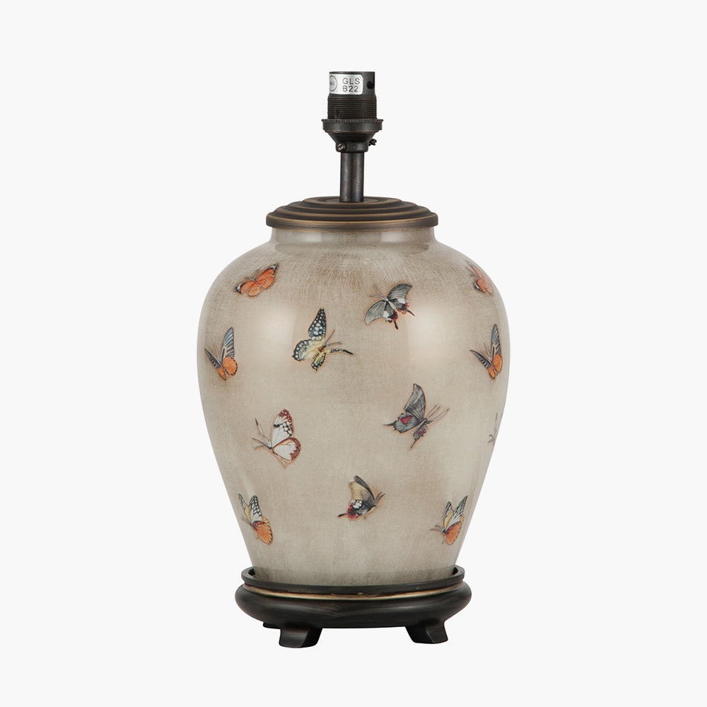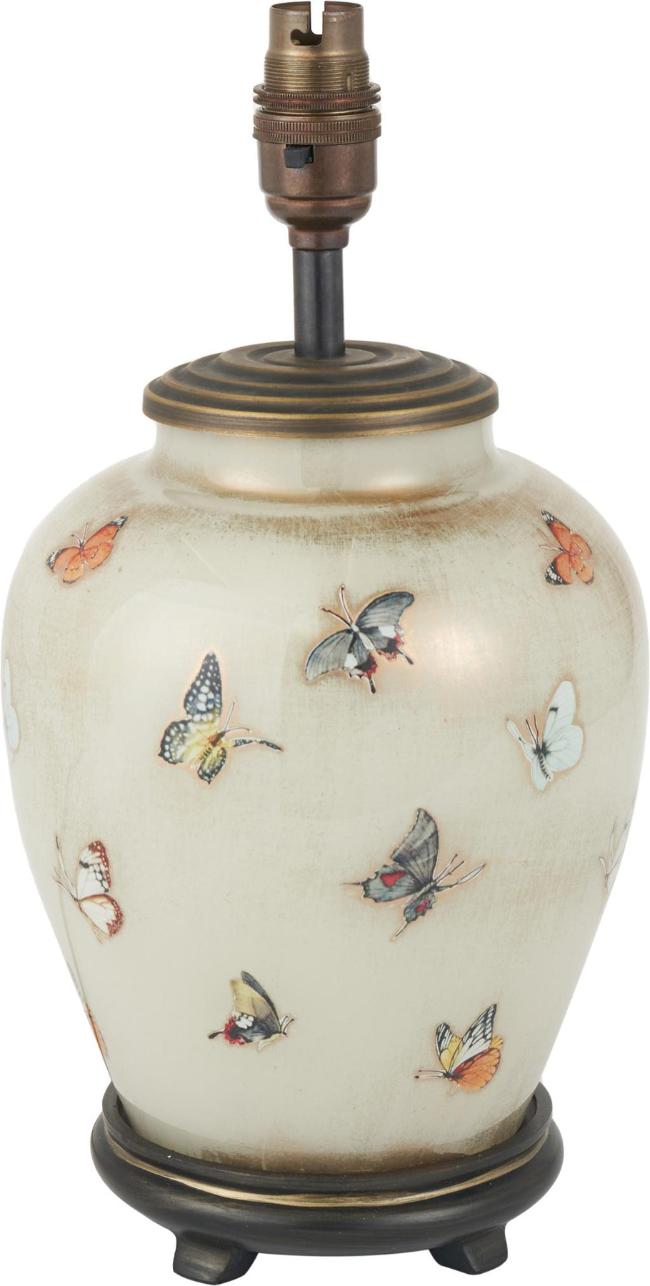 Our Jenny Worrell range features a beautiful array of designs. Lovingly referred to as antiques of the future, they made from hand-blown glass which is internally decorated with skilfully cut out images. This one features a dainty butterfly design on a distressed gold and off-white painted background. Recommended lampshade size: Cylinder 30cm diameter Recommended lampshade size: Empire 30cm diameter