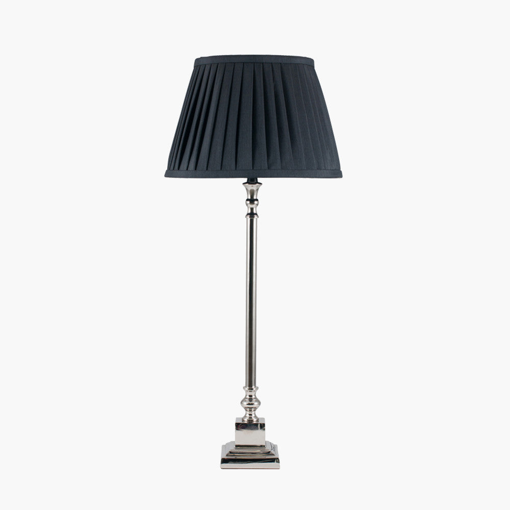 Simply elegant candlestick lamp base with a classical square foot and finished in shiny nickel. This base would look perfect in a small space or sideboard Recommended lampshade size: 30cm diameter