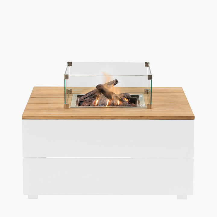 The Cosipure 100 White and Teak Square Fire Pit features an aluminium base, combined with a teak top for a modern natural look, making this table stylish and easy care. Despite the low profile of the table, it fits a 5kg propane gas bottle which is hidden away from view in a compartment under the table and doubles up as a contemporary design feature. The 5kg propane gas bottle can be purchased from all good gas retailers. Why propane gas? A conscious decision was made to make the fire pits only work on propane gas, and not on natural gas. Propane is one of the cleanest fuels in terms of CO2 emission and is a by-product of both the extraction of natural gas and the refining of crude oil. The Cosipure Firepit Table is delivered including a 30 mBar regulator with gas hose, 4 ceramic logs, lava stones and a battery to power the ignition. The Cosipure also comes with a metal plate to cover the firepit burner with the logs and lava stones removed so that it can be used as a full coffee table. Choosing a Cosipure with Teak Top? Do not cover the teak with a protective cover. You can leave the teak tabletop outside or store it inside. If left outside the teak will age naturally and beautifully when left to the elements.