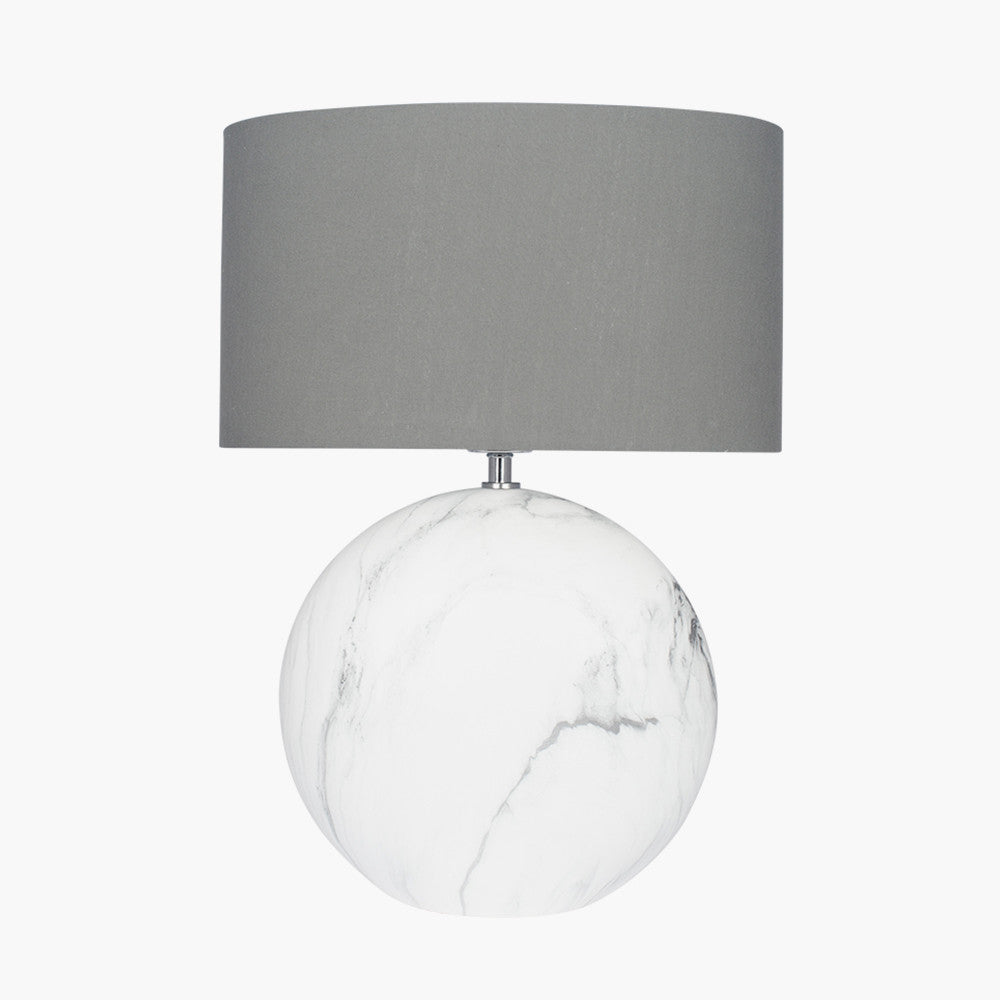 Who would believe this table lamp was ceramic and not marble! A very current marble effect ceramic table lamp, disc-shaped for that perfect console or shelf space crying out for some style! This lamp comes compete with a grey linen effect oval shade to complement it perfectly. Also available in a smaller size.