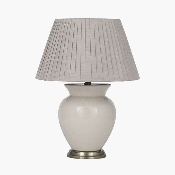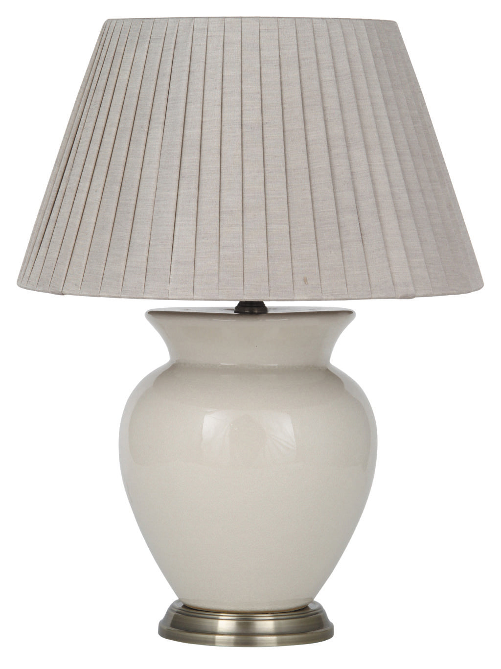 Natural cream ceramic table lamp with a subtle crackle effect. This stunning lamp comes complete with a self-coloured, taffeta effect, pleated tapered shade.