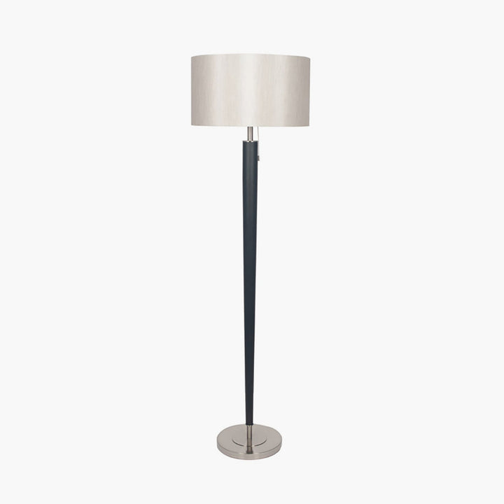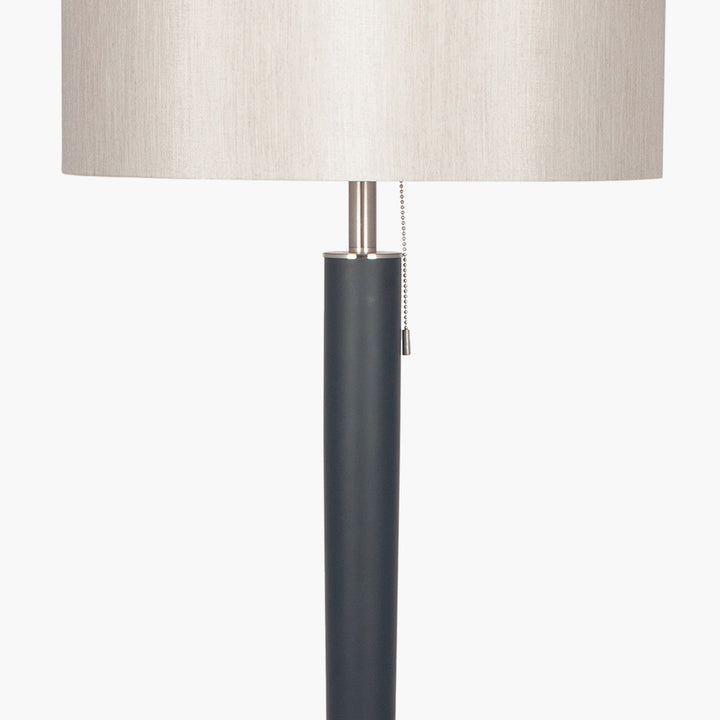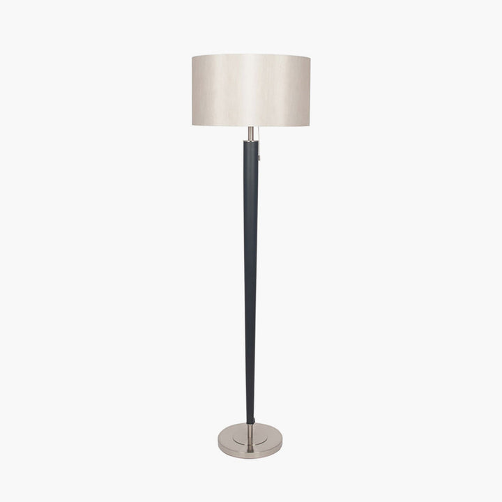 A sleek and modern contemporary floor lamp. The Lowry has a look of hotel chic finished with a matt black tapered stem and contrasting brushed silver details. Topped with a slubby grey faux silk shade and pull switch detail for added functionality. Also available as a table lamp and wall light.