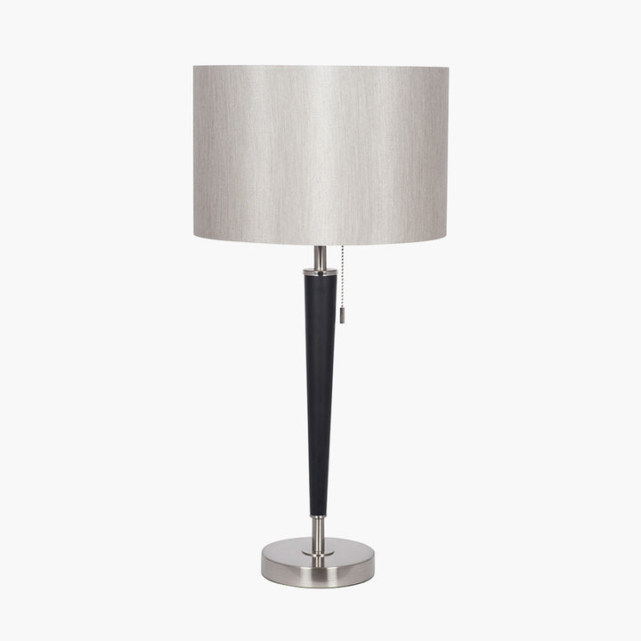 A sleek and modern contemporary table lamp. The Lowry has a look of hotel chic finished with a matt black tapered stem and contrasting brushed silver details. Topped with a slubby grey faux silk shade and pull switch detail for added functionality. Also available as a floor lamp and wall light.