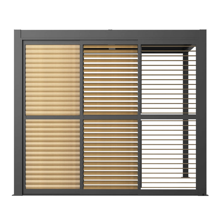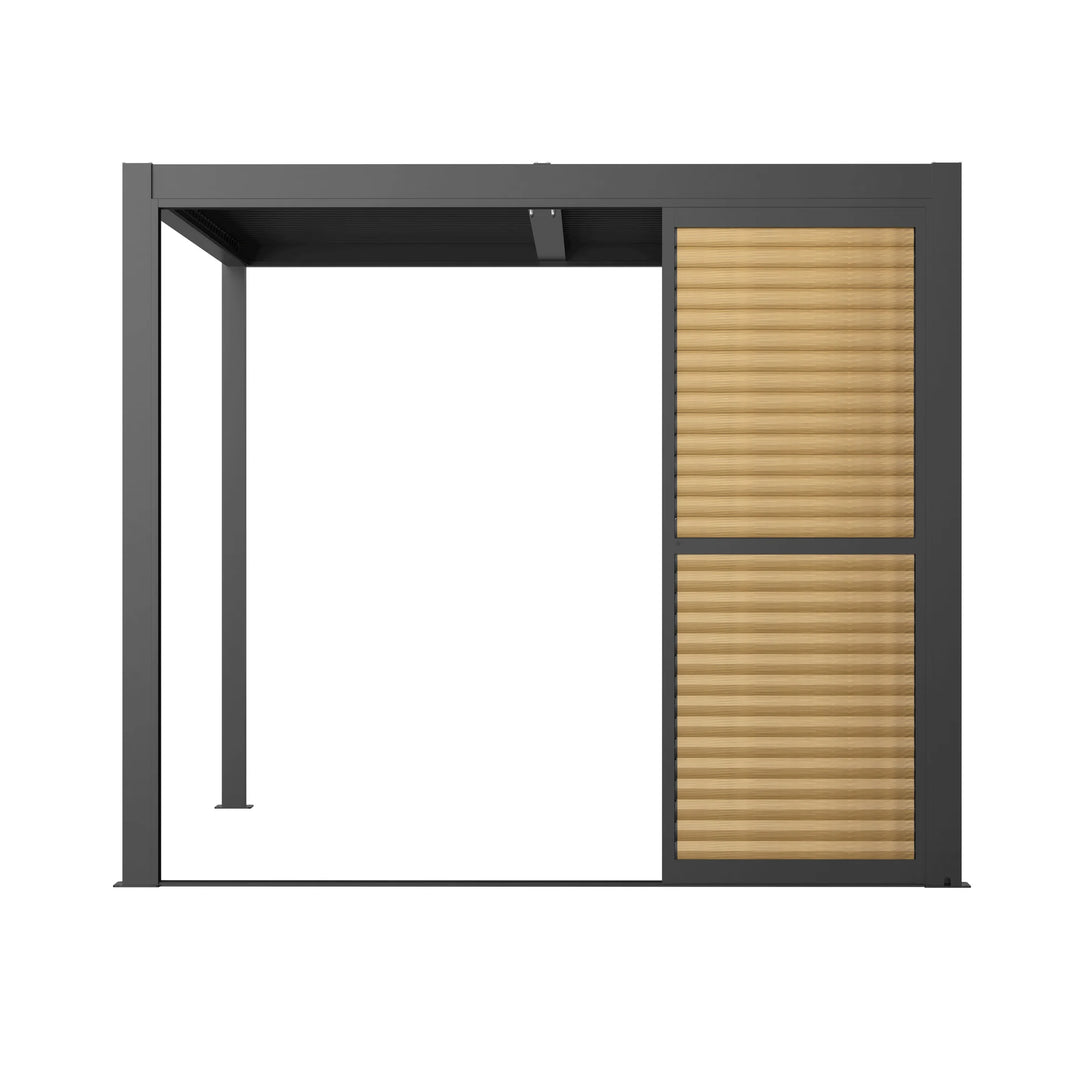 The adjustable louvre slats let you control sunlight, ventilation, and privacy with ease, creating the perfect outdoor environment year-round. With its smooth sliding design, this versatile door system allows you to open up your pergola for sunny summer gatherings or enclose it for a cosy, sheltered retreat during cooler months. Whether you’re seeking shade, airflow, or a more private setting, this door adapts to your needs while maintaining a stylish, natural look.