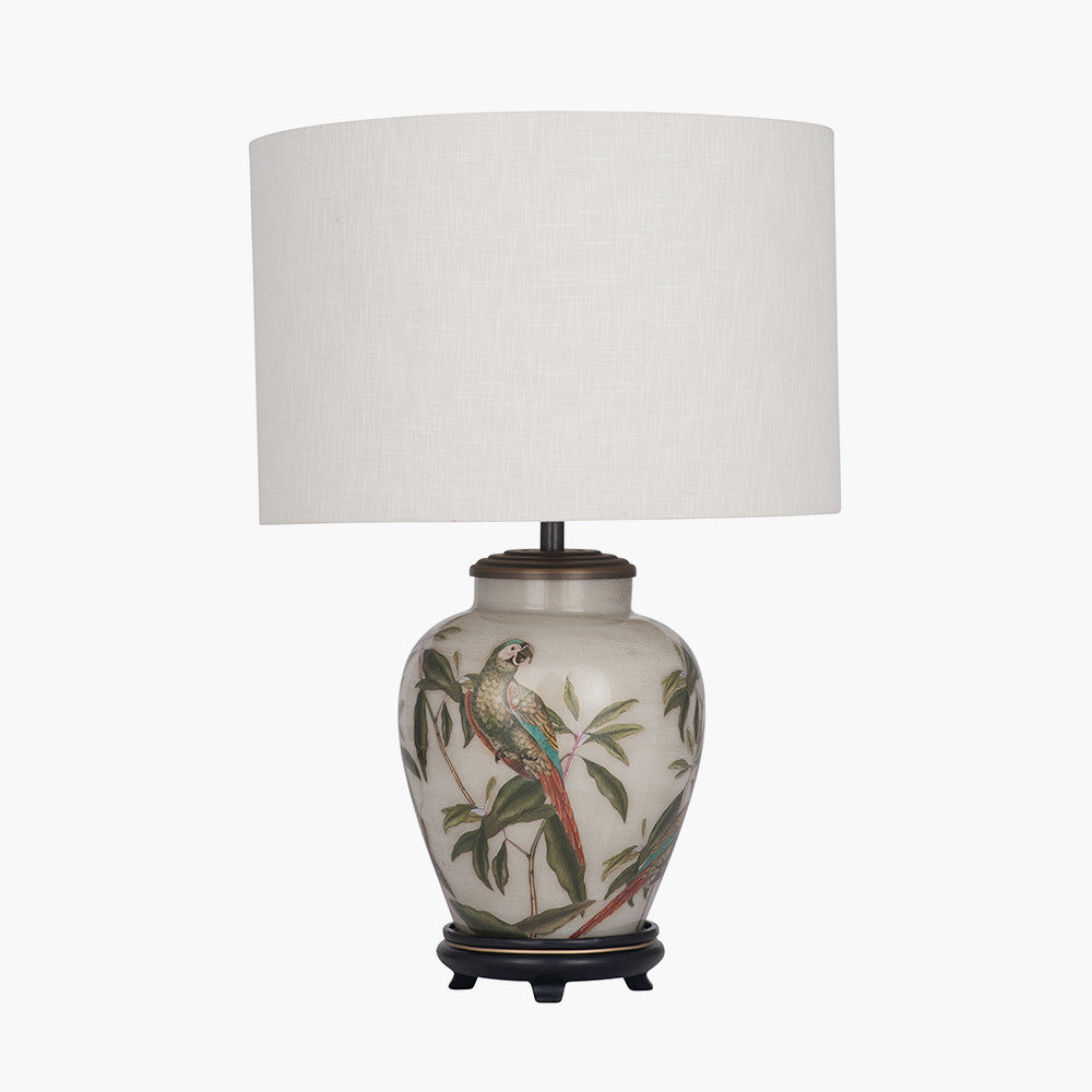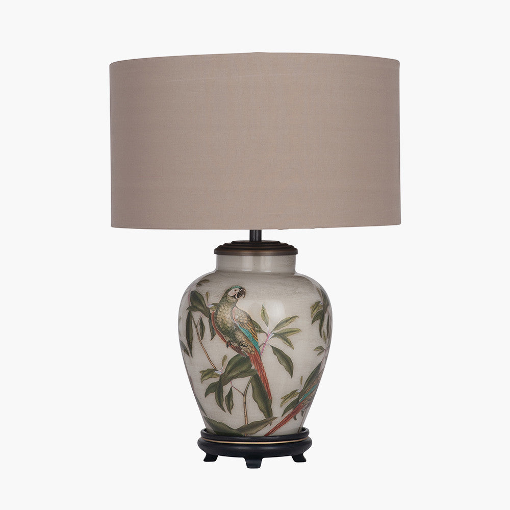 This hand-blown glass lamp is internally decorated with skilfully cut out images of leaves and quirky parrots. The background is distressed gold backed by soft, off white paint. Recommended lampshade size: Cylinder 30cm diameter Recommended lampshade size: Empire 30cm diameter