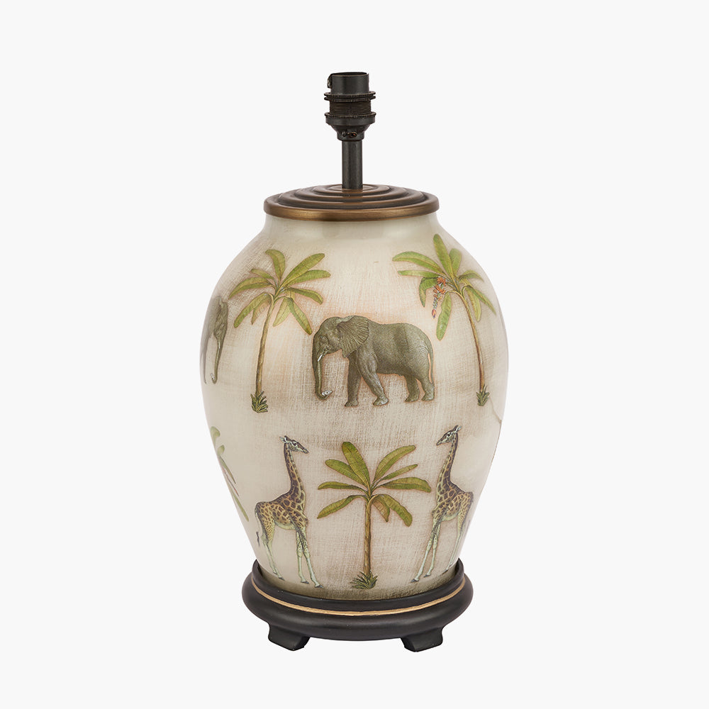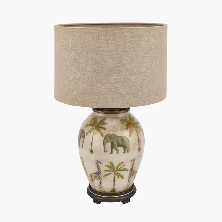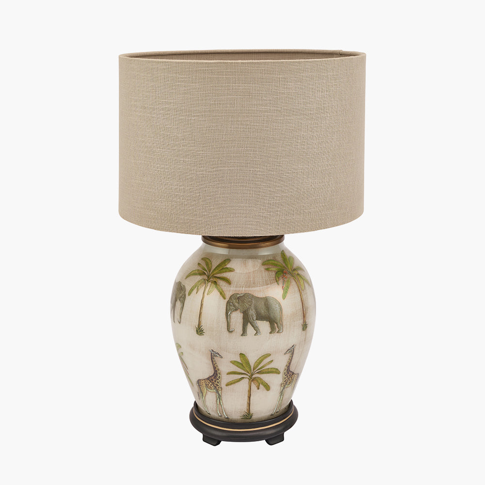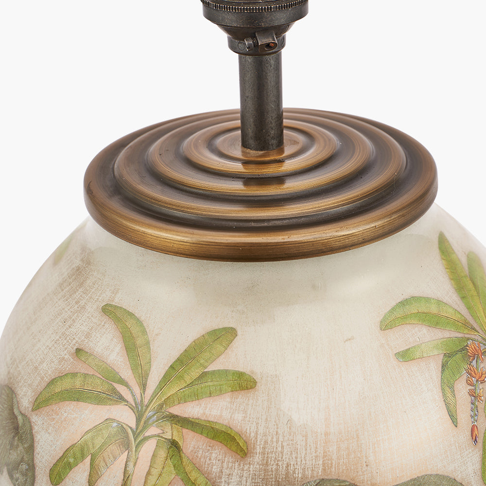 The iconic Jenny Worrall brand boasts a range of truly exquisite table lamp designs. Created using the traditional technique of potichomania, delicate decals are applied by hand within the base of the lamp. Each lamp design is then carefully built up with layers of hand-sponged lustre and colour to create the finished effect. The Safari design is pictured on a champagne gold-coloured background using a green, grey and brown palette for the animals and trees. The gold accenting gives the design depth and is synonymous with the Jenny Worrall brand. The glass is then completed with an antique brass finish base and top and a B22 light bulb holder in the same finish. Style with either a 35cm diameter cylinder lampshade or if you choose a very tapered style shade we would recommend using up to 40cm diameter.